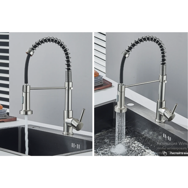 Смеситель кухонный с пружинным выдвижным краном, латунь; нержавеющая сталь с двойным носиком, ручной распылитель, насадка для душа
