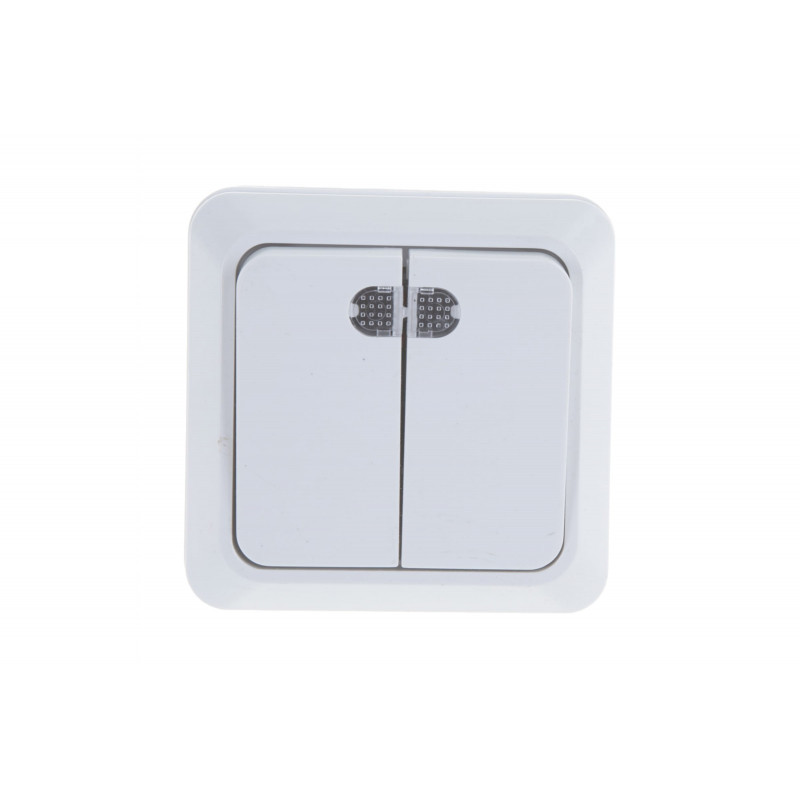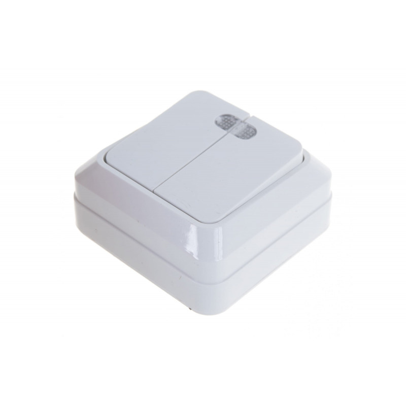 Двухклавишный выключатель с подсветкой, белый UNIVersal Олимп О0123 имеет классическую квадратную форму и белый цвет пластикового корпуса. Изделие легко устанавливается накладным способом. Служит для регулировки освещения многоламповых люстр или двух отдельных помещений, например, раздельного санузла или коридоров.